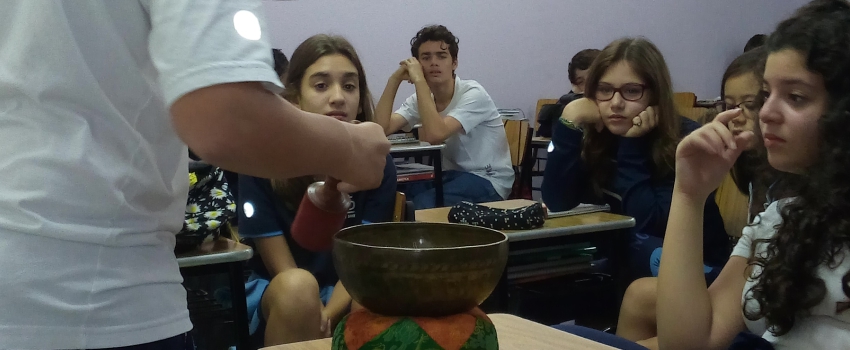 Isso foi o que os estudantes apresentaram aos colegas, a partir de informações coletadas em pesquisa. Felipe Gelain, por exemplo, explicou as funções e os usos da Tigela Tibetana – um instrumento utilizado nos rituais de cura e sacrifício Budismo Tibetano, pois suas vibrações proporcionam relaxamento mental e corporal. “Os monges tibetanos consideram o som emitido pelas tigelas como o som do coração, que conecta os sentimentos e as emoções positivas e saudáveis”, explica. Logo após, o educando fez uma demonstração sonora, utilizando o objeto trazido por sua família de uma viagem ao Nepal.