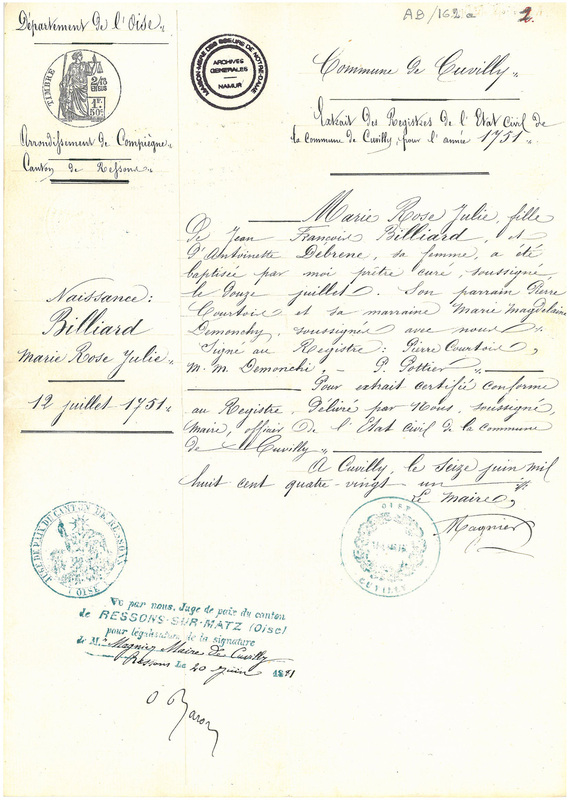 A 12 de julho de 1751, na Comuna de Cuvilly, Picardia, França, conforme certidão de nascimento, nasceu Marie Rose Julie Billiard, filha de Jean François Billiard e de Antoinette Debrène, tende sido batizada no mesmo dia. Seus padrinhos foram: Pierre Courtie e Marie Magdelain Demonchy.