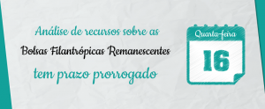 A Comissão Interna de Concessão de Bolsa de Estudo Filantrópica informa que devido à quantidade expressiva de recursos referentes ao Processo de Concessão de Bolsas Remanescentes para o ano letivo de 2016, o prazo de conclusão das análises será estendido. Por isso, a divulgação dos pareceres será divulgada somente na quarta-feira (16).