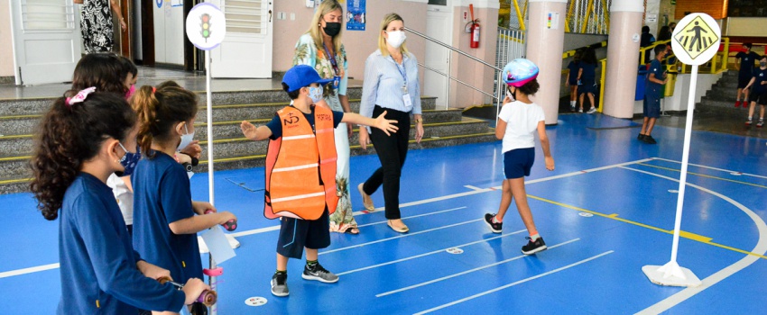 O assunto inspirou um dia de bicicleta, patinetes e skates no colégio. As diferentes rodas deram vida ao trânsito do minicircuito montado para estimular o desenvolvimento da