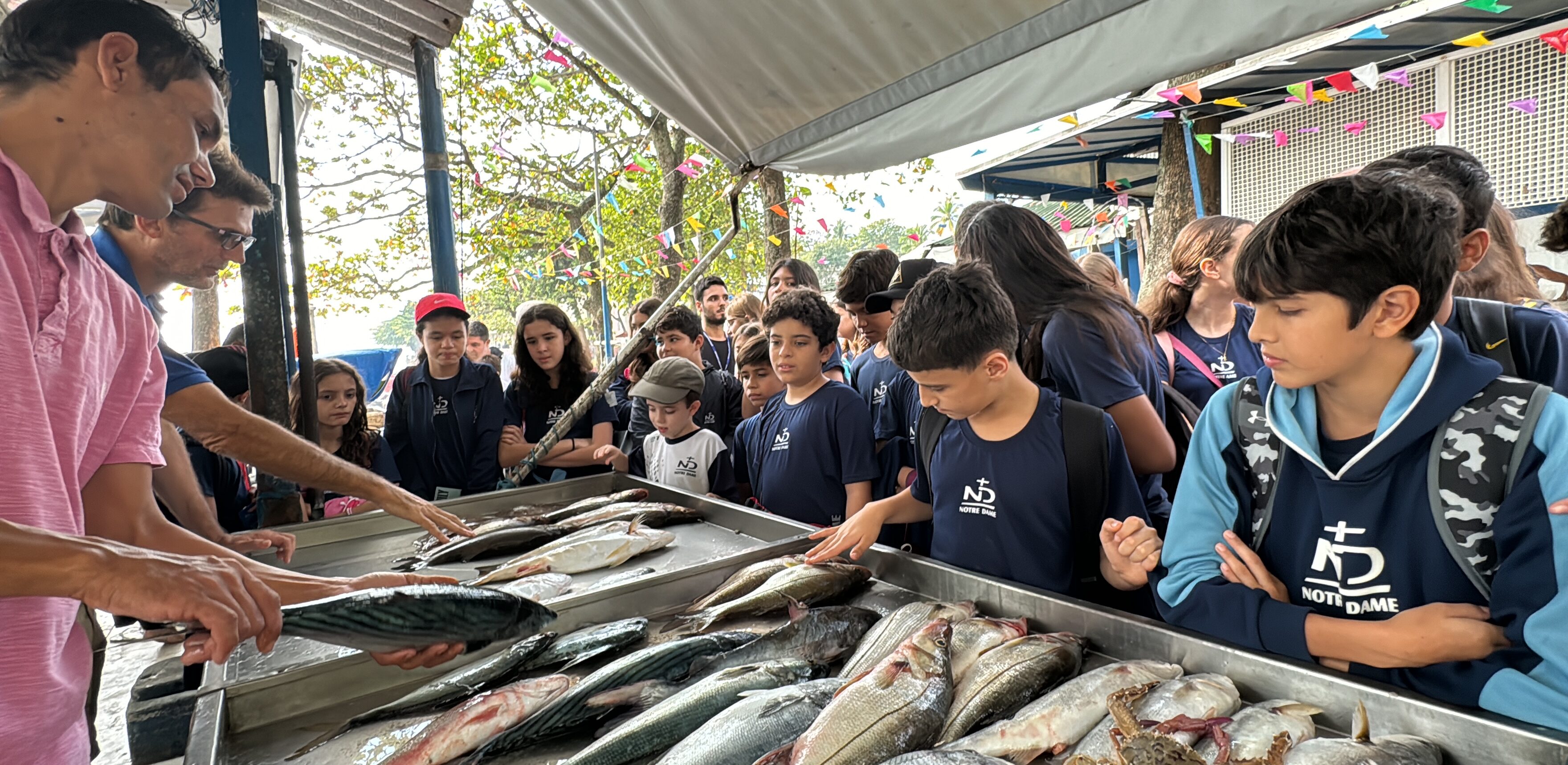 No terceiro ano do projeto “Um Mergulho no Oceano”, os alunos do 6º ano do Notre Dame Ipanema vivenciaram uma experiência significativa na Colônia de Pescadores de Copacabana. Com a orientação de Ricardo Gomes, mentor do projeto e fundador do Instituto Mar Urbano, eles conheceram a rotina dos pescadores, refletiram sobre a importância de manter as praias e os oceanos limpos e também visualizaram de perto alguns dos animais marinhos que ali vivem e são pescados diariamente.