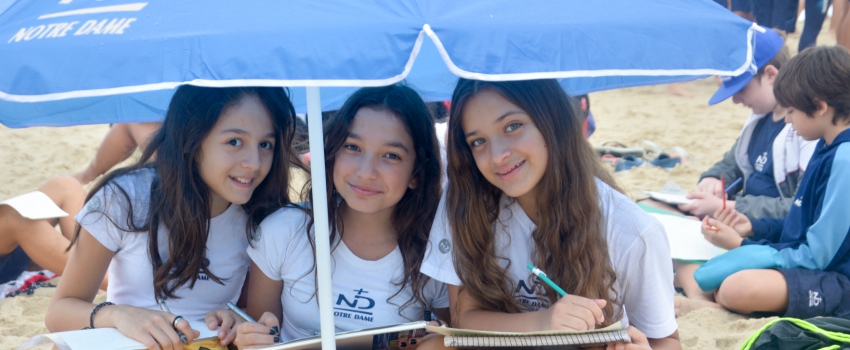 Ainda no auditório escolar, foram convocados pela diretora, Irmã Loiva Urban, a envolverem-se intensamente na quinta edição do projeto que celebra, de forma prazerosa, o desafio pedagógico diário. “Colégio Notre Dame Ipanema, marche para o mar! Quem ara a terra, o rio ou o mar abre sulcos e atualiza os vincos cerebrais, onde as sementes serão plantadas, onde os saberes são revolvidos, ampliados, partilhados e sistematizados. Arar o mar é desafio, meta e sonho de todo o fazer pedagógico”, conclamou docentes e discentes, alteando uma bandeira da instituição de ensino.