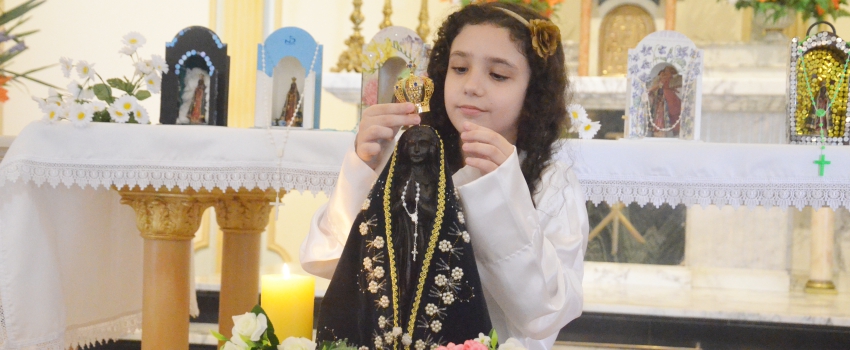Nas celebrações – realizadas em ambos os turnos -, duas estudantes adornaram a imagem de Nossa Senhora Aparecida, com o manto e a coroa. Além disso, as educandas do 5º Ano do Ensino Fundamental – que fizeram a primeira comunhão no mês de outubro – apresentaram danças, enquanto representantes das turmas conduziam até o altar os oratórios criados com seus colegas.