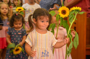 Ponto de grande emoção durante a Missa, a entrada de 90 girassóis, carregados por 90 estudantes da Educação Infantil ao Ensino Médio, marcou a homenagem às nove décadas da fundação do Colégio. Crianças entregaram, às mãos das Irmãs, um dos símbolos históricos da congregação, tudo ao som do hino alusivo ao centenário.