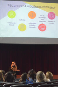 Durante a palestra, a Dra. Vanessa Cavalieri destacou questões importantes envolvendo responsabilidade parental e comportamento de crianças e jovens, incluindo o bullying, um crime cada vez mais recorrente. Ela também discutiu os efeitos prejudiciais do uso excessivo das redes sociais por parte dos estudantes, que impactam negativamente o seu desempenho intelectual e emocional. Além disso, a juíza também abordou a temática da depressão entre os jovens, assunto bastante relevante.