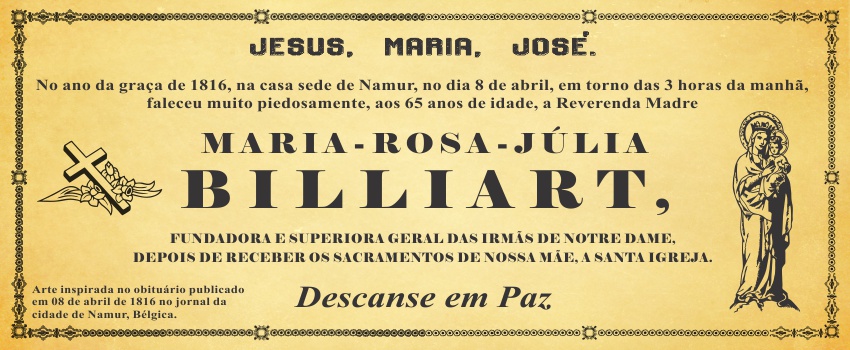 Era semana santa de 1816. Maria Rosa Júlia Billiart, fundadora da Congregação das Irmãs de Notre Dame, estava doente fazia uns três meses. Enfraquecida, guardava o leito, falando pouco, rezando, sorrindo e sofrendo. Na madrugada do dia 08 de abril, segunda-feira, pelas 3 três horas, entregou sua vida ao bom Deus.