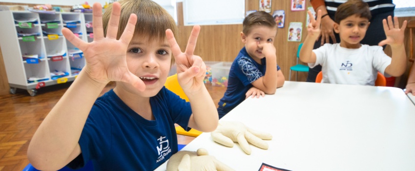 “Quantos dedos são necessários para formar o número 7?” No Integral Notre Dame, atividades lúdicas são planejadas diariamente para auxiliar na aprendizagem dos estudantes.