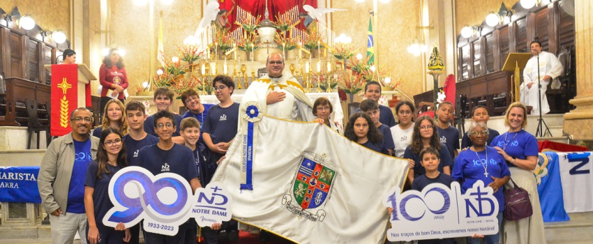 A convite do Vicariato Episcopal para a Educação da Arquidiocese do Rio, o Colégio Notre Dame Ipanema, representado pelas Irmãs Lourdes Dal Bosco, Maria do Carmo e Olga Strehl, pela coordenadora pedagógica do Ensino Fundamental II, Cristiane Granville, pelo professor de Ensino Religioso, Cláudio Jacinto, e por estudantes do 6°, 7° e 8° ano, foi saudado pelos 90 anos de fundação e 100 anos de presença das Irmãs no Brasil.