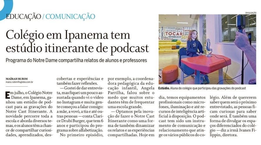 Entitulado NotreCast, o podcast Itinerante promovido pelo Colégio Notre Dame Ipanema ganhou as páginas do Jornal O Globo, reforçando a relevância da iniciativa educacional. O podcast, que se propõe a levar temas pedagógicos, reflexões e depoimentos diretamente de diferentes eventos escolares, foi reconhecido por sua criatividade e impacto na comunidade estudantil e familiar.