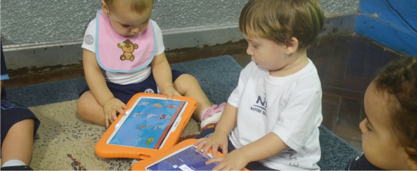 Uma nova e diferenciada aula de Informática acontece, semanalmente, nas turmas de Berçário II do Colégio Notre Dame Ipanema. Como os estudantes são, ainda muito pequenos, planejá-las é um desafio, como comenta a educadora de Informática Educacional da instituição de ensino, Bárbara Lacerda. “Precisa-se, a cada aula, priorizar formas diferenciadas para se proporcionar o contato com as tecnologias, entre elas o tablet e a lousa interativa”, explica.