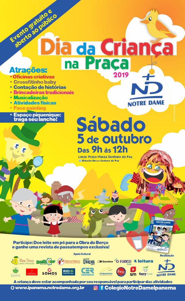 O Colégio Notre Dame Ipanema convida crianças e suas famílias para o 4º Dia da Criança na Praça!
